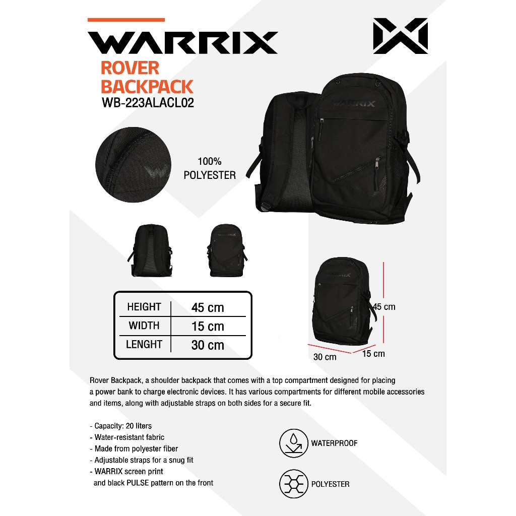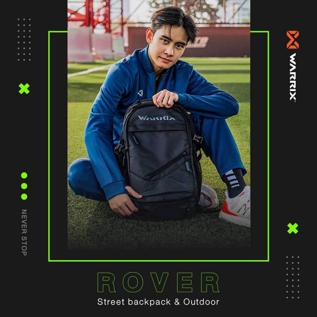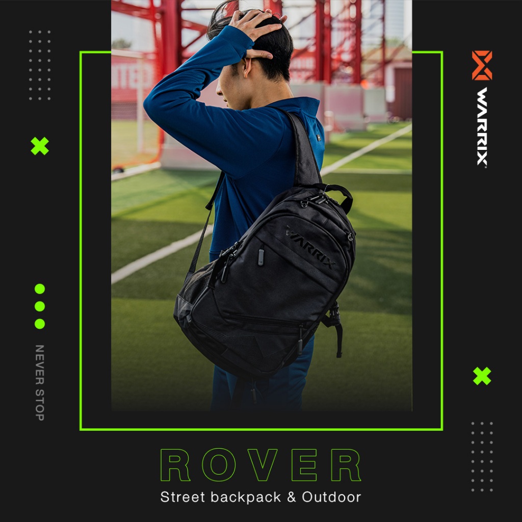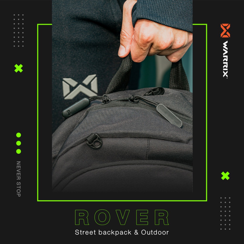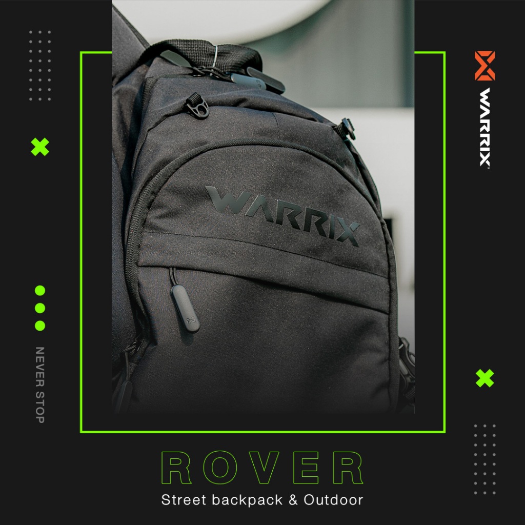 Rover Backpack, a shoulder backpack that comes with top compartment designed for placking a power bank to charge electronic devices. It has various compartments for different mobile accessories and items, along with adjustable straps on both sides for a secure fit.