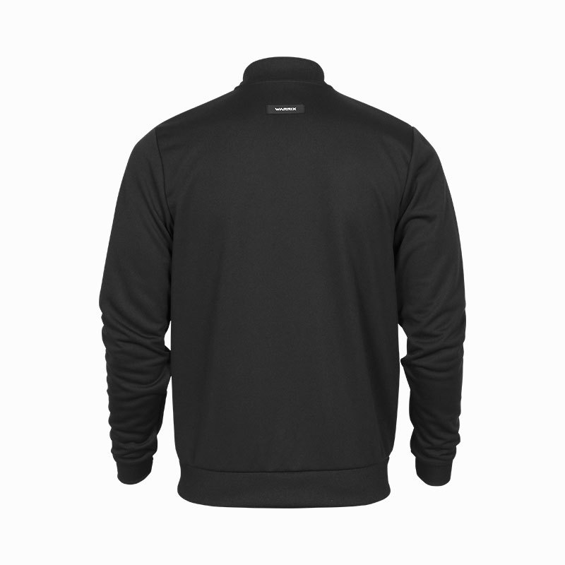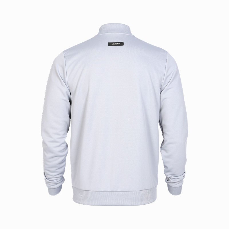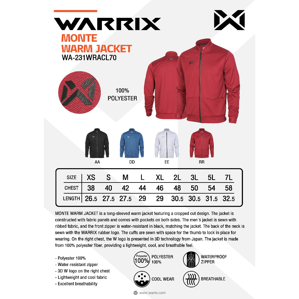 This is a long-sleeved warm jacket featuring a cropped cut design. The jacket is constructed with fabric panels and comes with pockets on both sides. The men's jacket is sewn with ribbed fabric, and the front zipper is water-resistant in black, matching the jacket. The back of the neck is sewn with the WARRIX rubber logo. The sleeves are sewn with a gap for the thumb to lock the wear. The right chest has a 3D W logo flex, technology from Japan. The jacket is made from 100% polyester fiber, providing a lightweight, cool, and breathable feel.